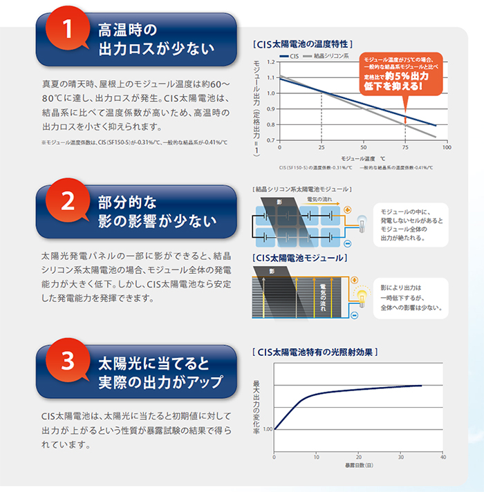 従来の結晶シリコン系太陽電池に比べて、CIS太陽電池は高温時の出力ロスが少なく、部分的な影の影響も少なく、太陽光に当たると出力が上がるという性質をもっているので次世代の太陽光モジュールとして注目されています。